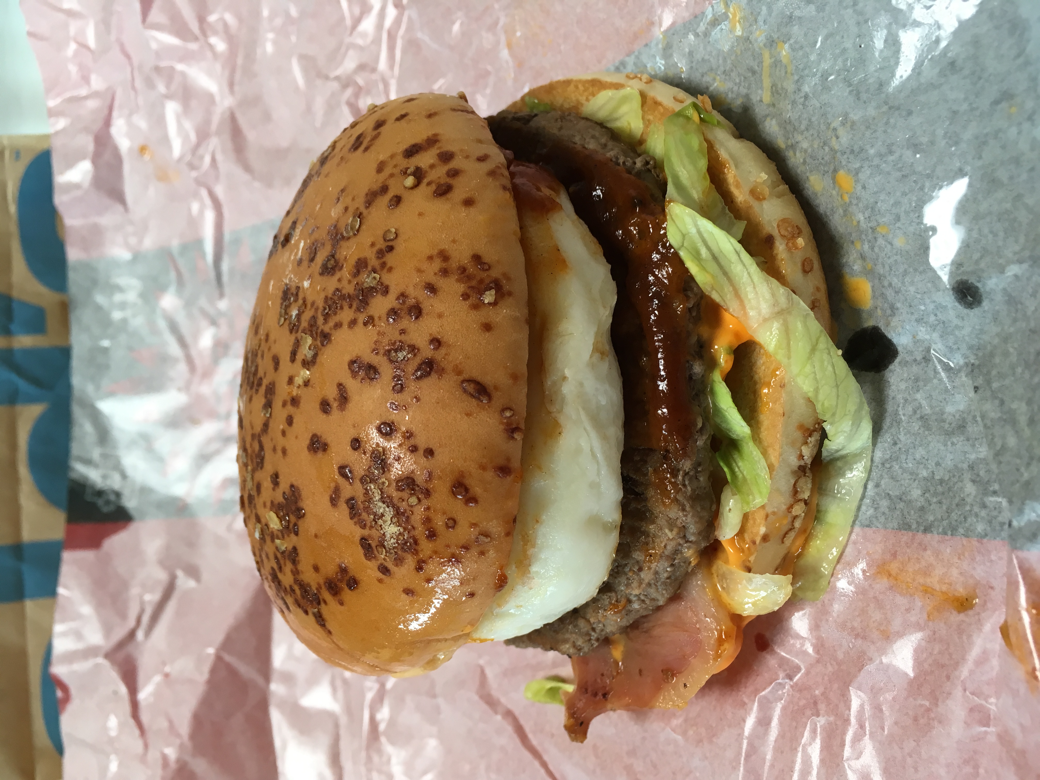チーズのかかった香ばしいバンズにプルプルたまご、肉厚なビーフは食べごたえあり!