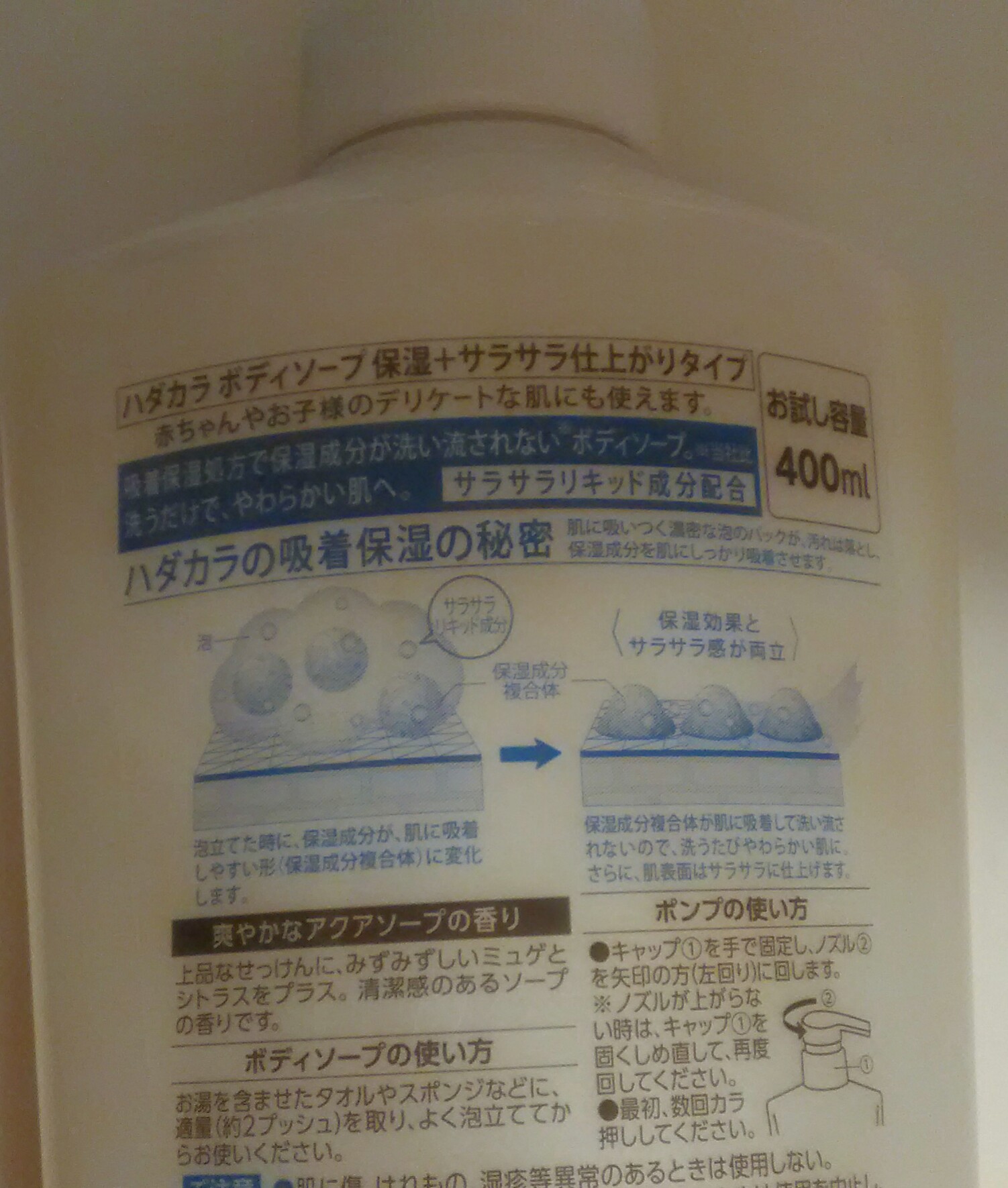 「日本初吸着保湿処方により保湿成分が洗い流されないボディソープ。保湿+サラサラ仕上がりタイプ。」ということで、乾燥肌の私にはピッタリ(o^^o)と期待して早速使用!!