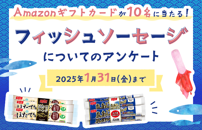 キャンペーンは終了しました。 たくさんのご応募ありがとうございました。 --*--*--*--* 「フィッシュソーセージ」についてのアンケートです。 「フィッシュソーセージ」の購入理由や食べるシーン等について聞かせてください。 期間中ア...