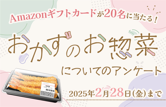 キャンペーンは終了しました。 たくさんのご応募ありがとうございました。 --*--*--*--* 「おかずのお惣菜」についてのアンケートです。 「おかずのお惣菜」の購入理由や食べるシーン等について聞かせてください。 期間中アンケートに回...