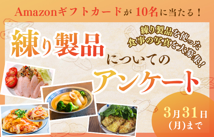 キャンペーンは終了しました。 たくさんのご応募ありがとうございました。 --*--*--*--* ふだんの食卓シーンに、どんな練り製品を使っているか教えてください。 アンケート内で練り製品を使った食事の画像をアップしてくだ...