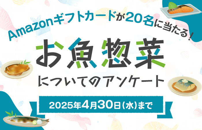 キャンペーンは終了しました。 たくさんのご応募ありがとうございました。 --*--*--*--* 「お魚惣菜」についてのアンケートです。 トレー付きあるいは袋入りの「お魚惣菜」の購入理由や食べるシーン等について聞かせてください。 期間中...