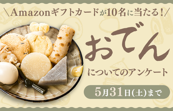 キャンペーンは終了しました。 たくさんのご応募ありがとうございました。 --*--*--*--* 「おでん」についてのアンケートです。 「調理用おでんだね」の購入理由や好きな具材等について聞かせてください。 期間中アンケートに回答いただ...