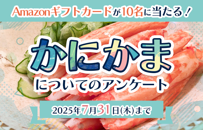 キャンペーンは終了しました。 たくさんのご応募ありがとうございました。 --*--*--*--* 「カニカマ」についてのアンケートです。 「カニカマ」のパッケージや購入理由などについて聞かせてください。 期間中アンケートに回答いただいた...