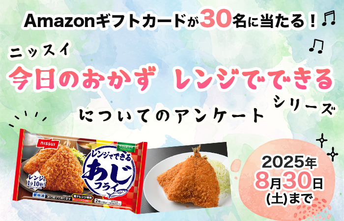 キャンペーンは終了しました。 たくさんのご応募ありがとうございました。 ニッスイの「今日のおかず レンジでできる」シリーズについてのアンケートです。 本商品のイメージや購入の有無などについて聞かせてください。 期間中ア...