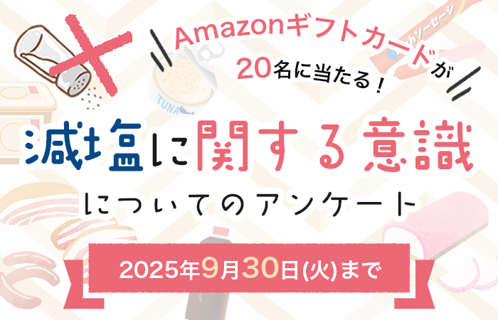 キャンペーンは終了しました。 たくさんのご応募ありがとうございました。 --*--*--*--* 「減塩に関する意識」についてのアンケートです。 普段の減塩に対するお考えについて聞かせてください。 期間中...
