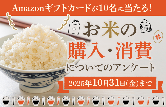 「お米の購入・消費」についてのアンケートです。 お米の購入や消費動向について聞かせてください。 期間中アンケートに回答いただいた方から抽選で10名にAmazonギフトカード1,000円分をプレゼント! 応募要領 ...